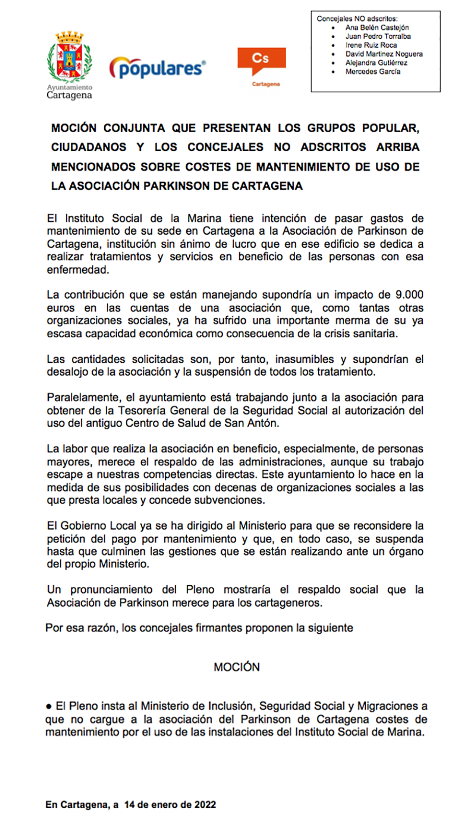 Carta dirigida a la consejera de Mujer, Igualdad, LGTBI, Familias y Política Social, Isabel Franco Sánchez, y al director provincial del ISM, Julián Paredes Martínez, por la Asociación de Parkinson de la Comarca de Cartagena, firmada por su presidente, Jorge L. Lombardero Menéndez, sobre el uso de la Casa del Mar.