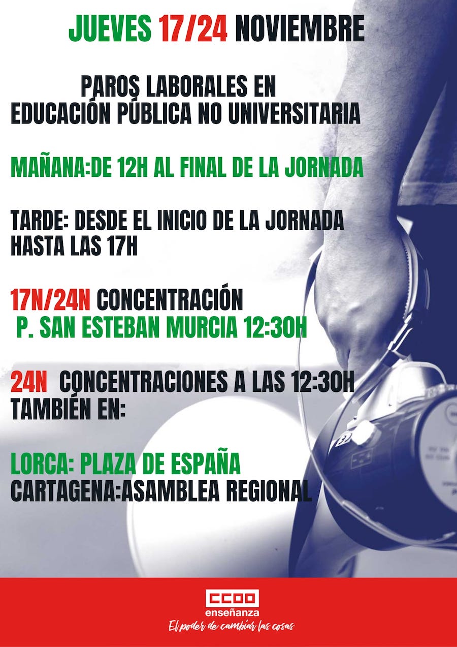 Comienzan hoy y se prolongarán hasta el día 24 en la educación pública. Esta mañana también hay una concentración ante el Palacio de San Esteban en Murcia ciudad y para la semana próxima se convoca otra ante la Asamblea Regional en Cartagena.