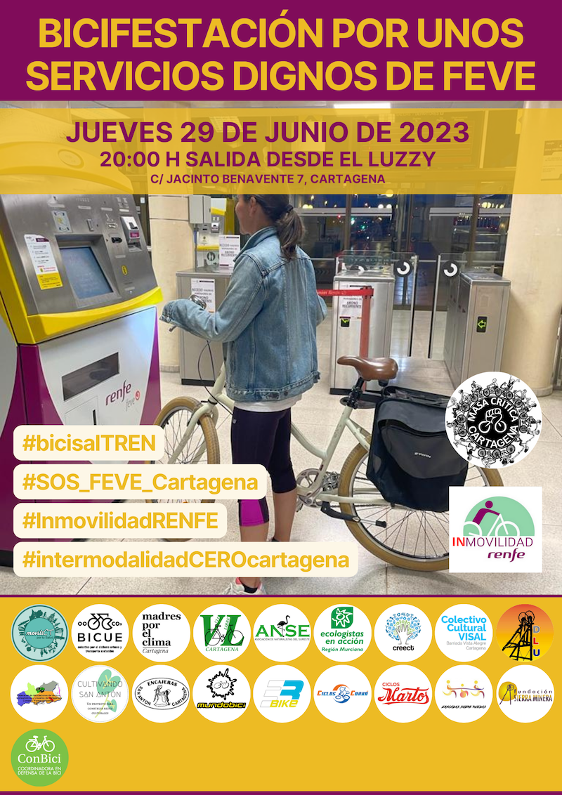 “Hay que ser consecuente con los compromisos escritos. Según consta en la página Web de Renfe: ”Todos sus trenes de Cercanías y FEVE permiten viajar con bicicleta sin límite de horario”. Pero al parecer la región de Murcia, en lo que a la línea de ancho métrico se refiere, no forma parte del resto de la red nacional, donde hemos podido comprobar que no se aplican estas restricciones”, comenta Paula Valdivieso Ferrándiz, de Madres por el Clima.