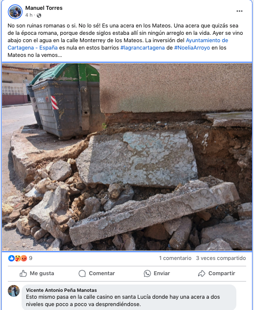 Manuel Torres García, secretario general del PSOE de Cartagena, ha publicado en su perfil de Facebook la imagen de un tramo de la baldosa de la calle Monterrey de Los Mateos que se ha hundido con las lluvias caídas en la jornada de ayer.