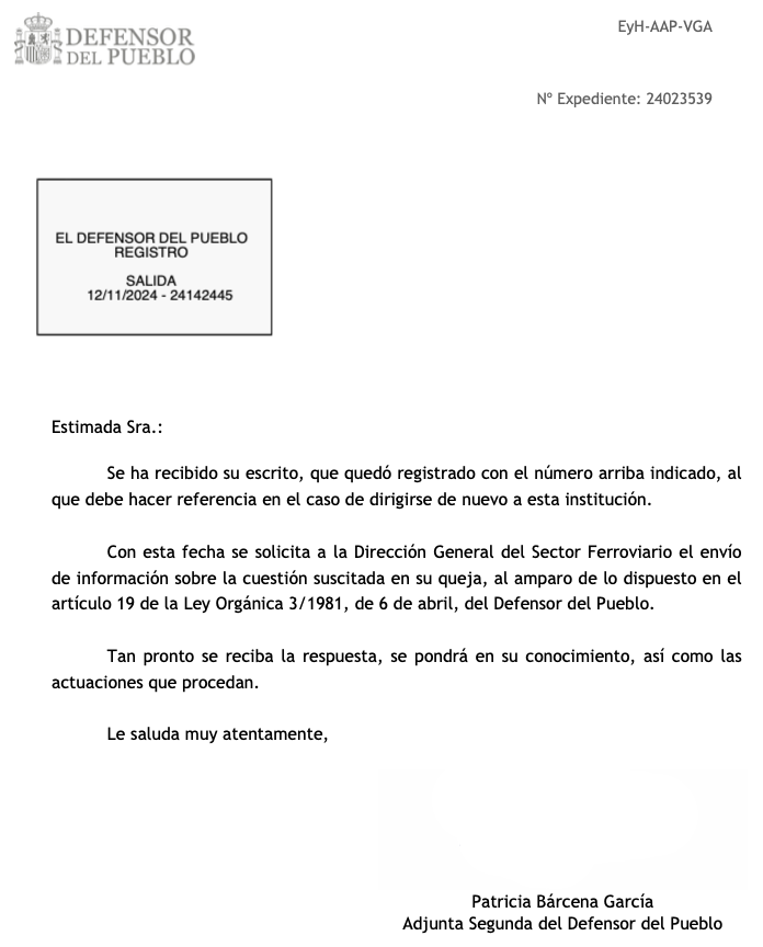 Respuesta del Defensor del PuebloEl Defensor del Pueblo ha comunicado que ha iniciado un procedimiento solicitando información a la Dirección General del Sector Ferroviario, conforme a la Ley Orgánica 3/1981, de 6 de abril. La institución revisará las actuaciones y mantendrá informadas a ambas asociaciones sobre los avances, comprometiéndose a garantizar una respuesta adecuada y transparente por parte de las autoridades.