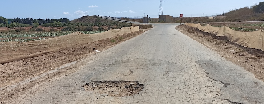 El remitente pide actuación urgente (“Así lleva al menos un año”) del que corresponda, pues no sabe si es competencia de la Comunidad de Regantes o de las autoridades civiles (autonómicas o locales), “pues es el acceso al camino viejo de Pozo Estrecho, que es la vía principal y la que da acceso a los caseríos y a la ermita de la zona. “El socavón va a más y echar un pegote de asfalto o cemento no es tan complicado, pues el resto de la vía, salvo dos puntos más, está bien”, apunta.