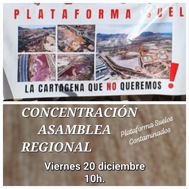 La 'Plataforma contra la contaminación de Cartagena' ha convocado una concentración ciudadana ante la Asamblea Regional para este viernes a partir de las 10 horas de la mañana en protesta por la actitud de las administraciones regional y municipal respecto a la situación de abandono 2que sufrimos los ciudadanos con los metales pesados de Zincsa, El Hondon y Peñarroya", indican.