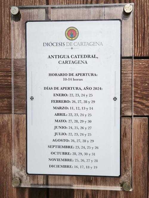 Despierta CT, comprometidos con la difusión y preservación del patrimonio cultural de Cartagena, comunica hoy su profunda preocupación por el reiterado incumplimiento por parte del Obispado de Cartagena en relación con la actualización del horario de apertura de la Catedral de Cartagena.Según lo establecido en la normativa vigente, es obligatorio que el horario de apertura se publique en un lugar visible y se mantenga actualizado para garantizar el acceso y la información a ciudadanos y visitantes. No obstante, se ha constatado que en la Catedral se continúa exhibiendo el horario correspondiente al año 2024, evidenciando una clara dejadez y falta de voluntad para cumplir con estas obligaciones.