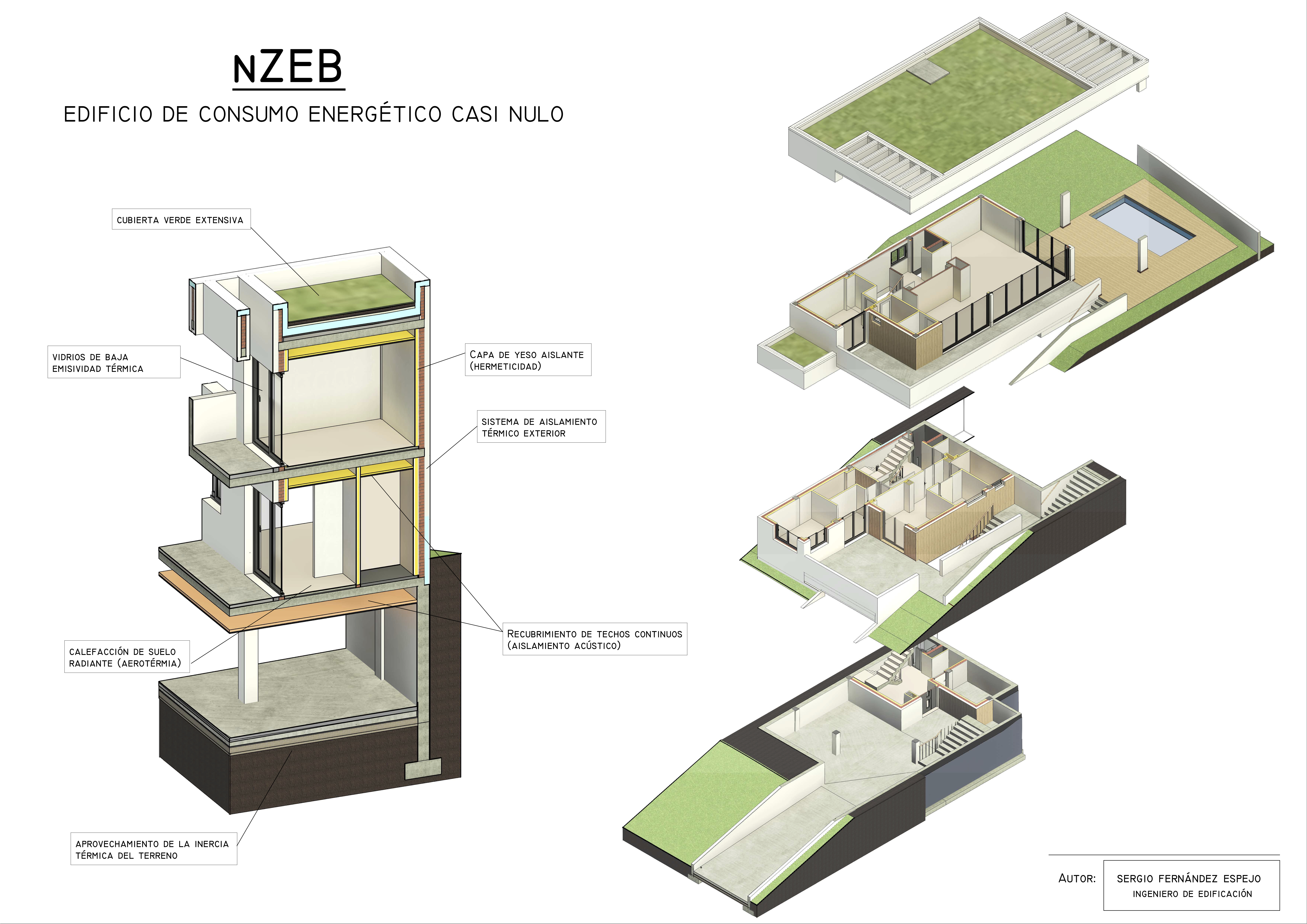 El proyecto presentado bajo el título de “Vivienda unifamiliar aislada con piscina. Edificio de consumo energético casi nulo (nZEB)” tiene como objetivo dotar a la vivienda de instalaciones eficientes que sean capaces de aportar las condiciones necesarias para una habitabilidad y confort extra, cumpliendo los valores exigidos por la normativa vigente para la máxima certificación energética.