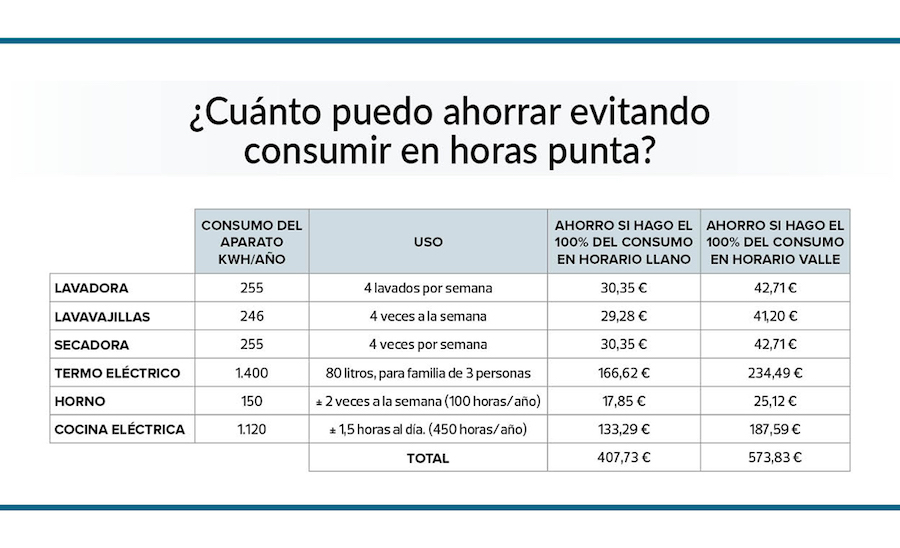 OCU señala que si se consigue evitar el horario punta (de 10 a 14 horas y de 18 a 22 horas en laborables), cuando se usa la lavadora, el lavavajillas y la secadora es posible ahorrar en torno a unos 30 € al año por cada uno de estos aparatos sin necesidad de usarlos de noche, solo aprovechando el horario llano los días laborables. Programando por la noche estos electrodomésticos (o los fines de semana en horario valle, el ahorro podrá alcanzar los 130 € entre los 3 electrodomésticos.
