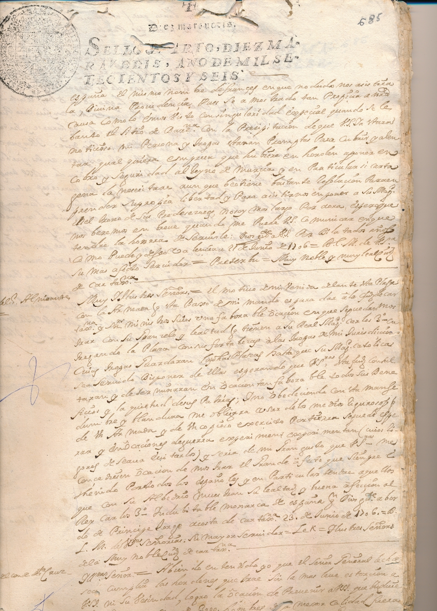 A bordo del “Príncipe Jorge” a costa de Cartagena, 23 de junio de 1706. Besa las manos de Vuestras Señorías su mayor servidor. Lek. Ilustres Señores de la Muy Noble Ciudad de Cartagena.