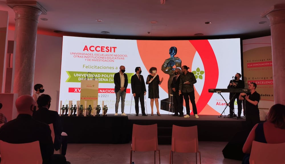 El proyecto de la Universidad Politécnica de Cartagena ha sido distinguido con un accésit en los Premios Alares de Conciliación, que se entregaron anoche. Los Premios Alares 2021 han contado con la presidencia de los Reyes de España y se han celebrado, en formato semipresencial, en el Palacio de Neptuno de Madrid. La Fundación Alares, creada en 2005, busca "fomentar la competitividad económica poniendo a las personas en el centro del bienestar y estimulando iniciativas de mejora de su calidad de vida".