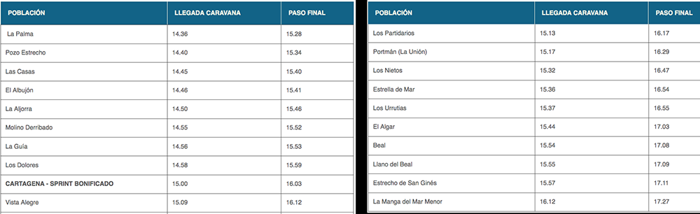 Está previsto que la caravana entre al municipio de Cartagena, en La Palma procedente de la localidad vecina de Torre Pacheco a partir de las 14.30 horas. Una vez llegada la caravana, los últimos primeros del pelotón llegarán pasados unos 40. Los cortes de tráfico en los barrios y diputaciones del municipio serán intermitentes, al paso de la carrera..