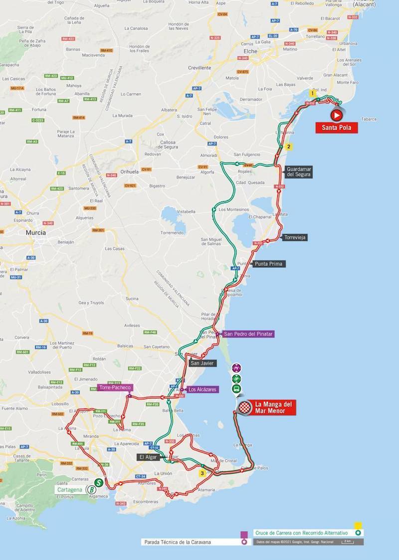 Está previsto que la caravana entre al municipio de Cartagena, en La Palma, procedente de Torre Pacheco a partir de las 14.30 horas y que todo el pelotón tarde alrededor de 40 minutos en pasar. Los cortes de tráfico en los barrios y diputaciones del municipio serán intermitentes, al paso de la carrera.