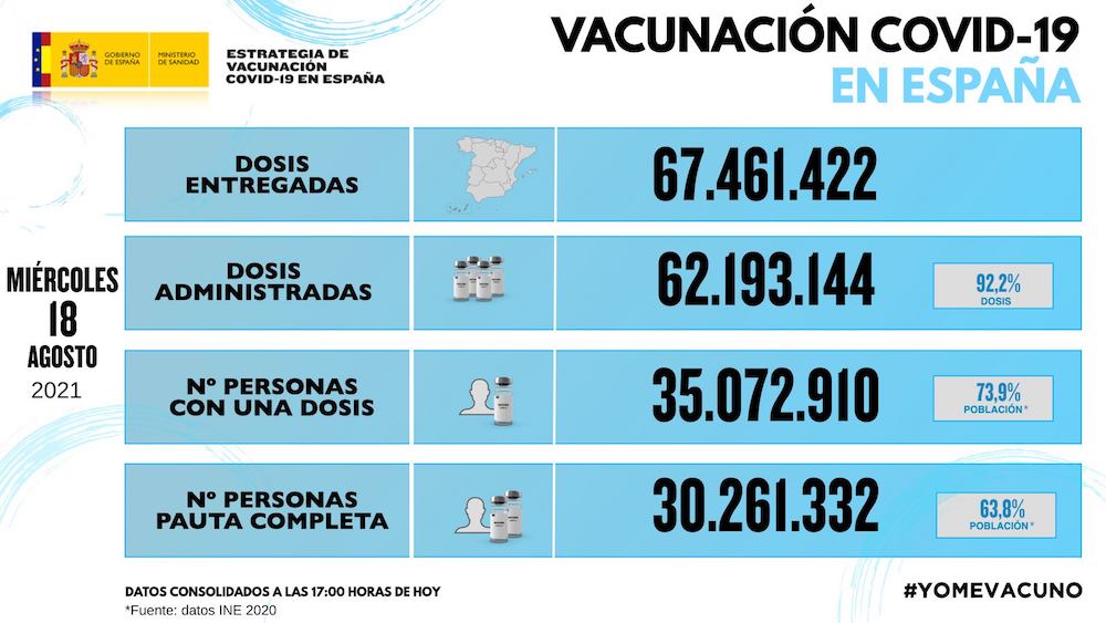 España ha superado los 30 millones de personas con la pauta completa de vacunación frente a la COVID-19. Así, el 63,8% de la población ya ha finalizado su vacunación frente a la SARS-CoV-2.