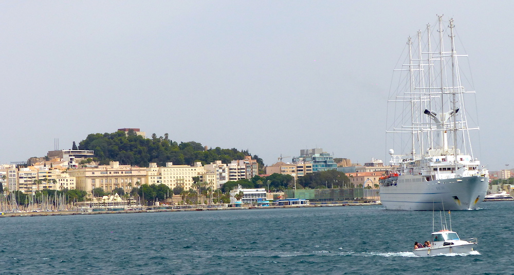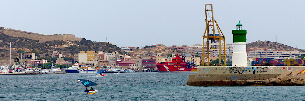 Leer más...Imagen de una persona practicando surf en aguas de la bahía de Cartagena y de la salida de un crucero a vela del puerto.