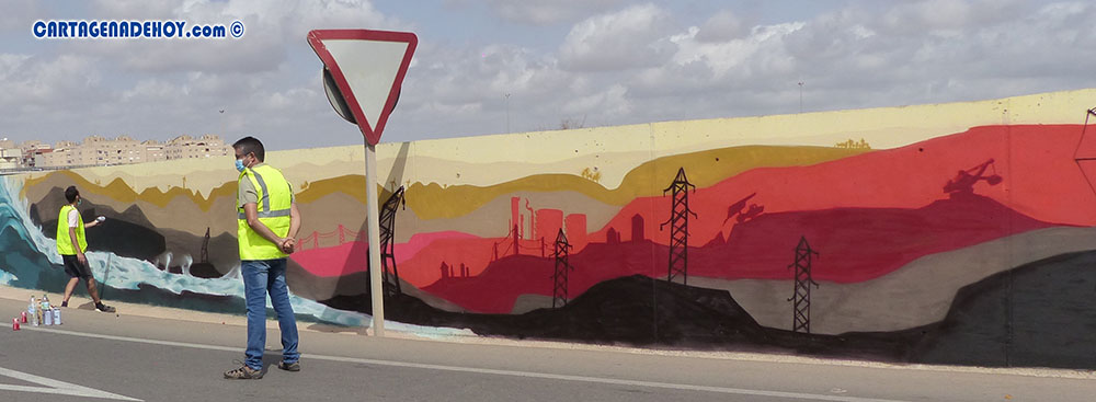 La Concejalía de Juventud continúa impulsando el talento de los artistas urbanos locales. Una nueva muestra de ello es el graffiti que dará la bienvenida a Cartagena desde la rotonda de Villa París y que se está llevando a cabo gracias a la financiación de la Concejalía de Turismo.