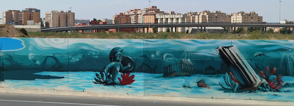 Se trata de una nueva intervención que están realizando Pepeteño y Stam, dos grafiteros de amplia trayectoria, con tipografía característica del graffiti y una ambientación submarina y que servirá para mejorar la estética de uno de los principales accesos a la ciudad.