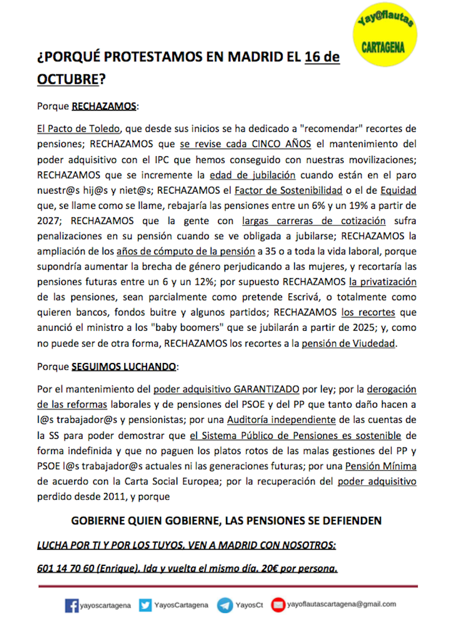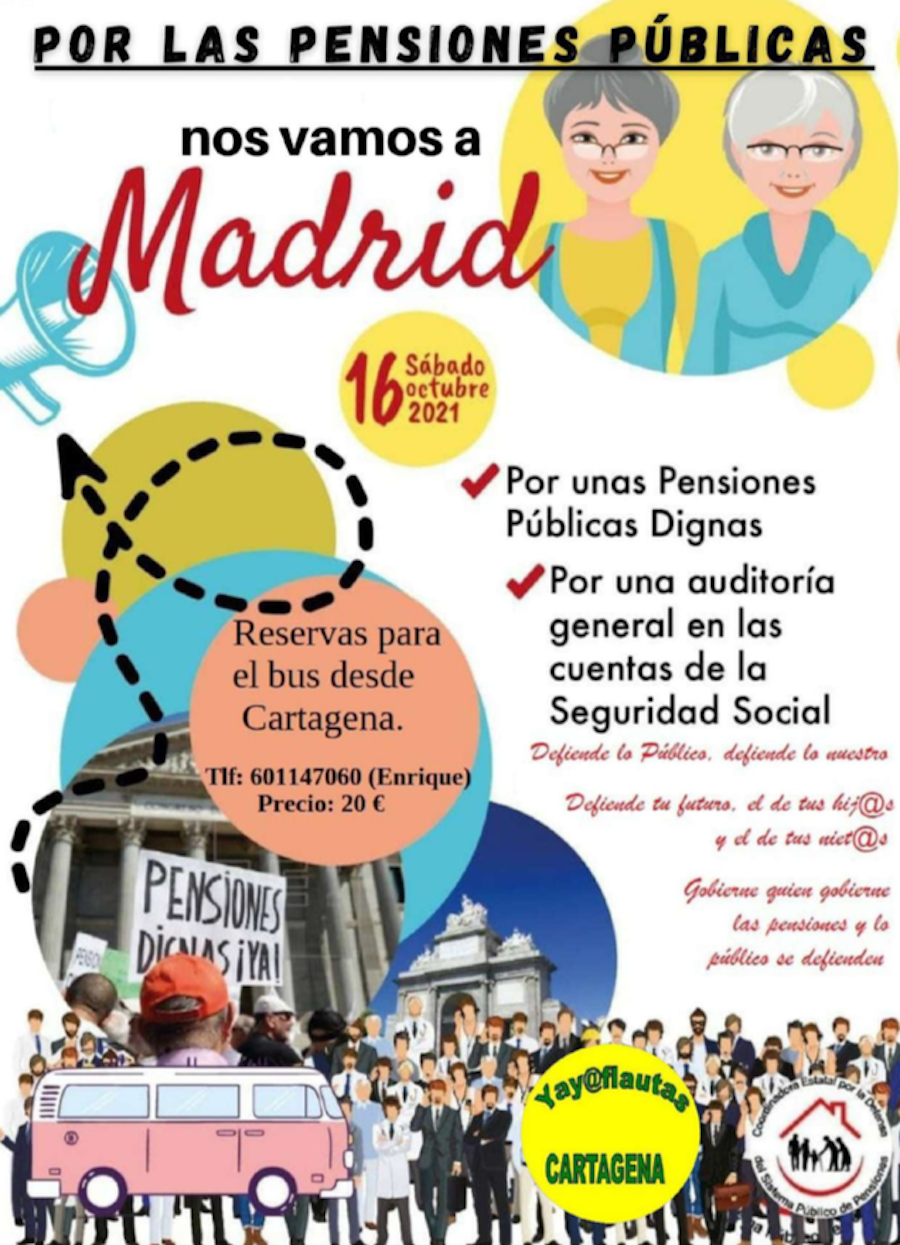 Personas mayores de Cartagena participarán en la macromanifestaciókn nacional que el 16 de octubre tendrá lugar en Madrid para exigir al Estado unas pensiones digna y para que se le haga una auditoría de cuentas a la Seguridad Social para demostrar que el sistema público de pensiones es sostenible, para lo que se ha iniciado una campaña de recogida de firmas. Hace dos años tuvo la anterior protesta en la capital de España con cincuenta mil personas y ahora se espera otra masiva participación. Los cartageneros que quieran acudir pueden reservar plaza en autobús al precio de 20 euros a través del teléfono 601 147 060, informan desde Yayoflautas Cartagena.
