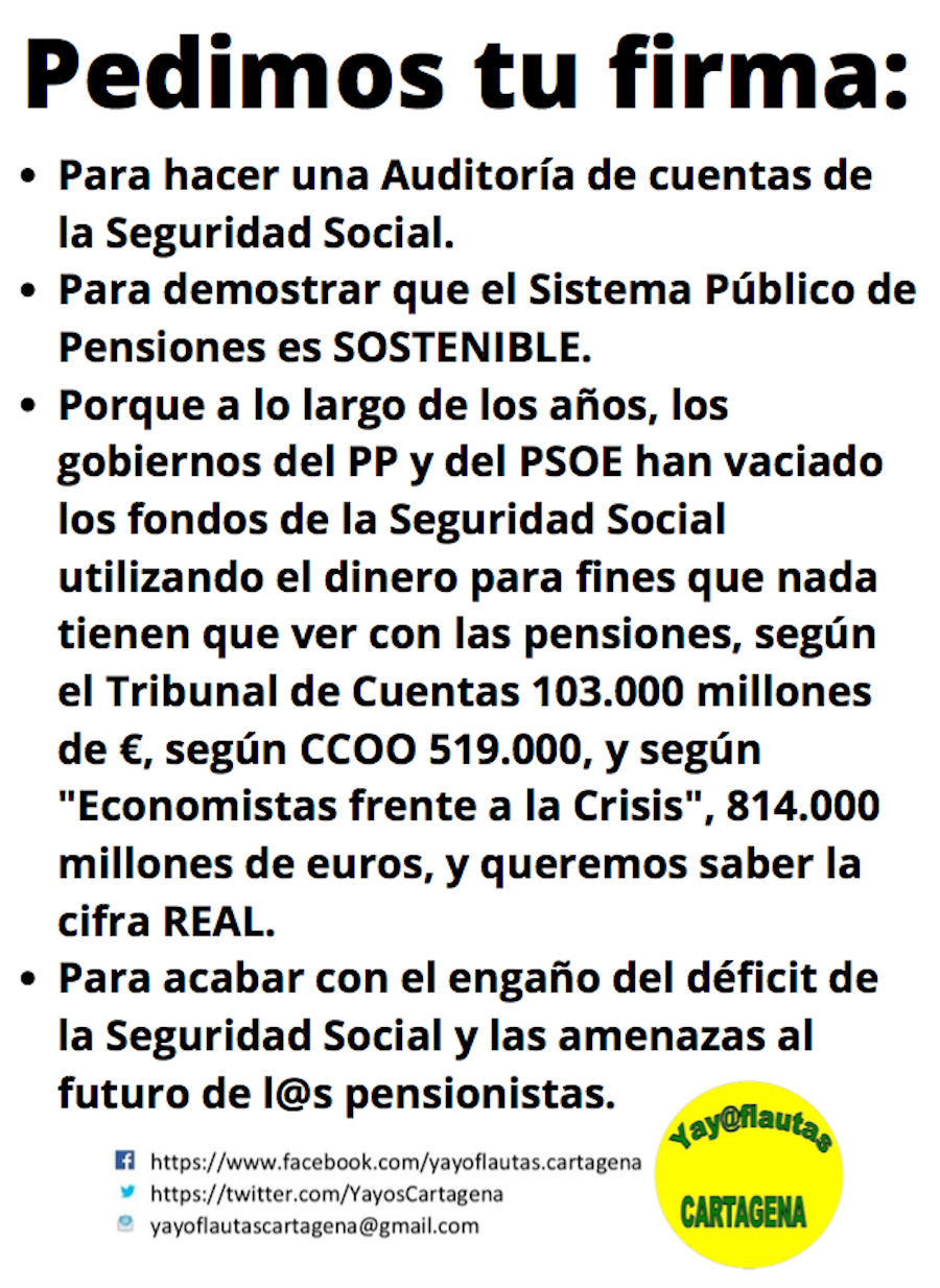 “Por ello, en muchas localidades se ha reiniciado toda una batería de movilizaciones (lunes al sol, movilización en Madrid el próximo 2-O con otros colectivos por lo público...) que van a dar continuidad a un nuevo 16 de Octubre, en el que nos desplazaremos de muchos puntos del país para reclamar en la Cortes que se atiendan nuestras (y vuestras) reivindicaciones y se están recogiendo firmas para hacer una auditoría seria a la Seguridad Social, dado que existen estudios que afirman que es el Estado el que debe dinero a los fondos de la Seguridad social, en una horquilla que va desde 103.000 a 800.000 millones de euros”.