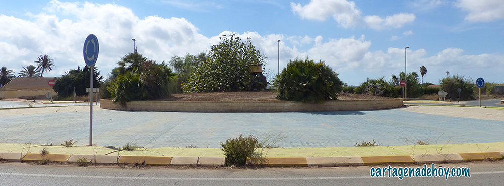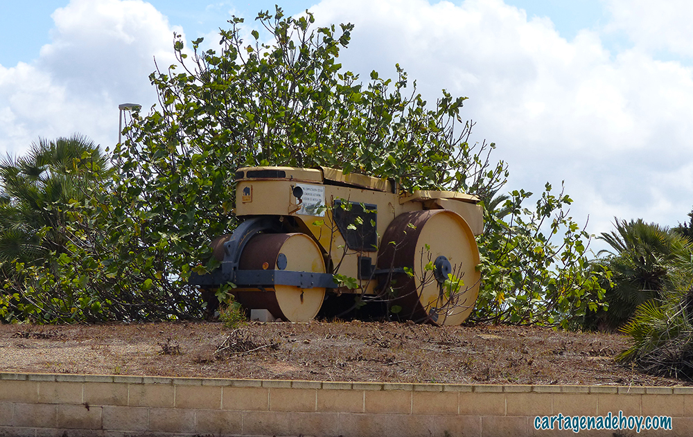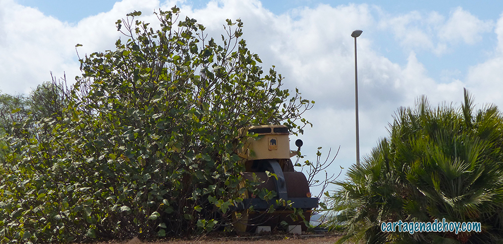 Curiosa imagen captada en la redonda del cruce de las carreteras entre Los Beatos-La Palma y La Aparecida-La Puebla, donde se observa como el crecimiento de las ramas del árbol ocultan gran parte de la máquina de aplanar que figura en el centro de la rotonda.