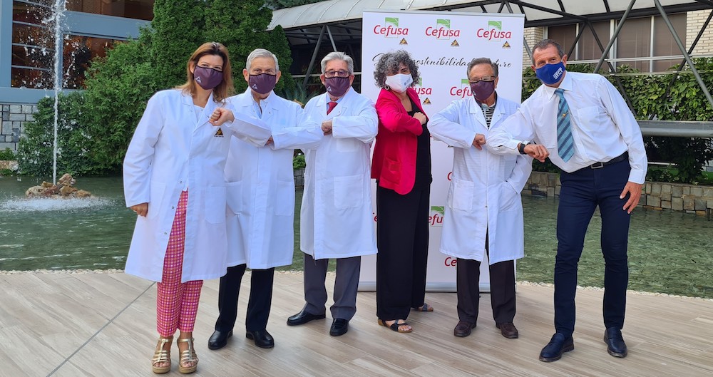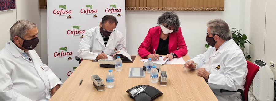 La rectora de la UPCT, Beatriz Miguel, y el presidente del grupo empresarial, Tomás Fuertes, su consejero delegado, José Fuertes, y el delegado general de Cefusa, Juan Cánovas, han sellado la renovación de la cátedra, cuyo plan de actuaciones para este curso académico incluye estudios de trazabilidad y eficiencia de depuración, análisis del subsuelo de las balsas de almacenamiento y cuantificación de las emisiones gaseosas.
