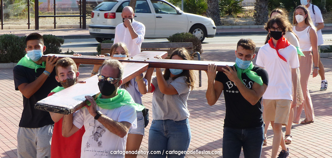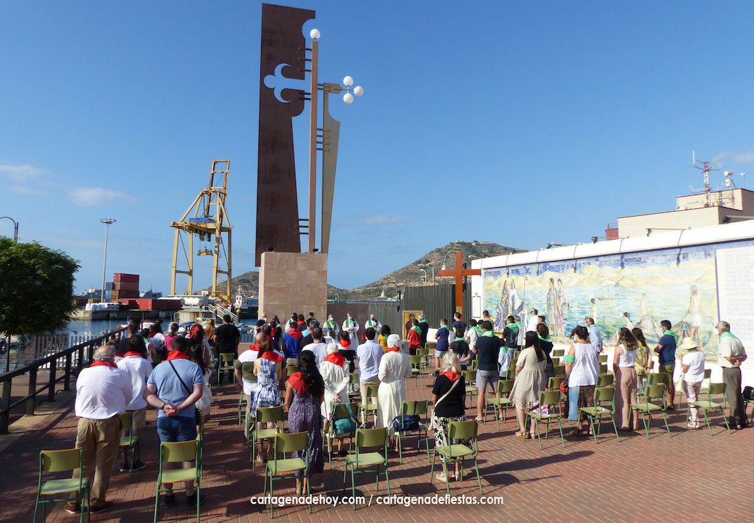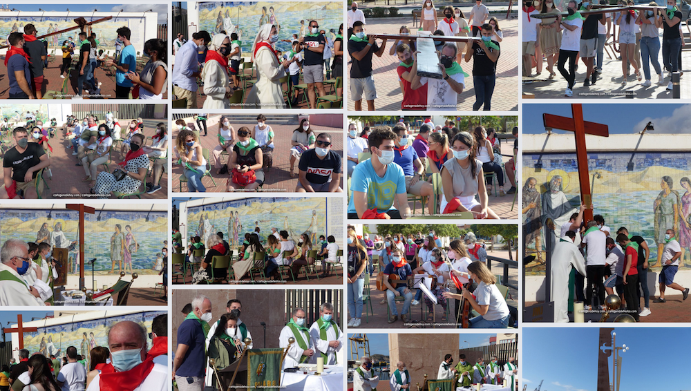 Finalmente, la cruz de los jóvenes no ha llegado por mar a la dársena de Santa Lucía, sino por tierra desde Orihuela. Una vez trasladada junto al mural que representa la llegada del apóstol a Hispania, junto a la Virgen ‘Salut Populis Romana’, que la acompaña en su singladura, se ha celebrado una misa de campaña de bienvenida, que se ha ofrecido concelebrada por varios sacerdotes ante un público a los que se ha obsequiado con pañuelos verdes y rojos. Una soleada mañana con refrescante brisa marina ha acompañado la celebración.