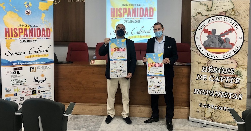 Hoy se ha puesto en marcha el ciclo que desarrollará su programa de actos hasta el 17 de octubre y que pretende ser una unión de culturas hispanohablantes, donde personalidades representativas de Hispanoamérica y España hablarán de historia y de las oportunidades culturales y empresariales que supone estar más unidos. En la jornada inaugural de esta tarde, entre otros actos, ha ofrecido el espectáculo 'Viaje a la Hispanidad' y el encuentro 'Youtubers por la hispanidad'. En la imagen, los presidentes de la Cámara de Comercio de Cartagena y de la asociación cultural Héroes de Cavite en el acto de presentación.