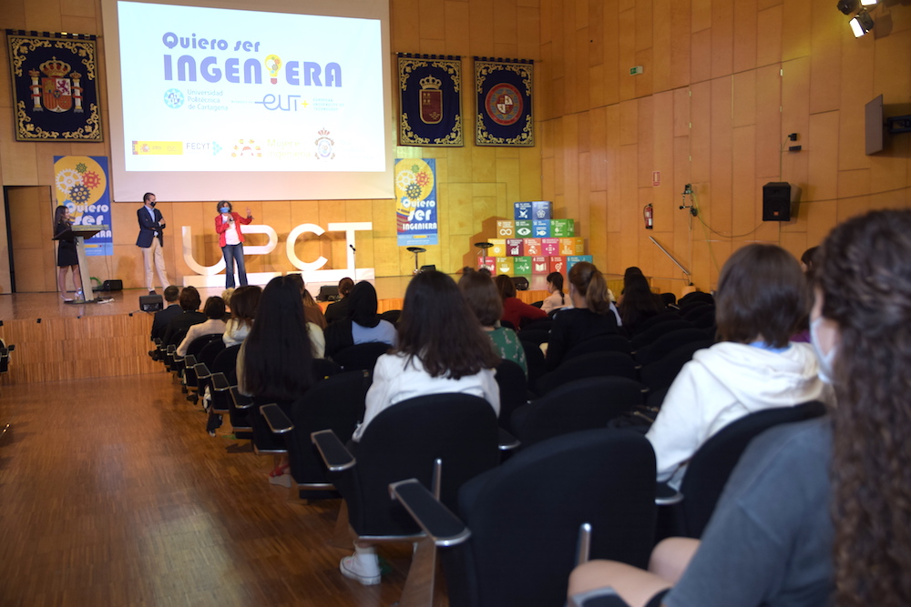 La monologuista científica e ingeniera en Técnicas Reunidas Patricia Martínez ha presentado el evento, que ha incluido actividades de divulgación científico-técnica para alumnas de Secundaria de cinco institutos de la Región de Murcia y uno de Almería, así como una feria estudiantil en la que participarán los equipos y asociaciones Solar Team, Moto UPCT, Drone Team e IEEE-UPCT.