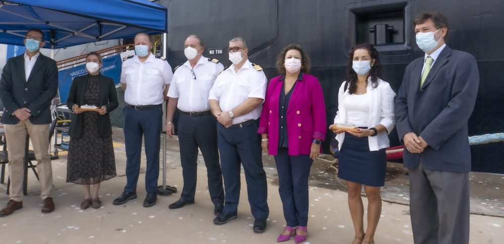 La presidenta de la Autoridad Portuaria, acompañada de la concejal de Turismo de Cartagena, Cristina Pérez, del responsable de la consignataria Erhardt Mediterráneo, Sergio Conesa, y de personal responsable de cruceros de la APC, han dado la bienvenida al capitán del buque Vasco de Gama, en su primer atraque en el puerto de Cartagena, con el tradicional intercambio de metopas.