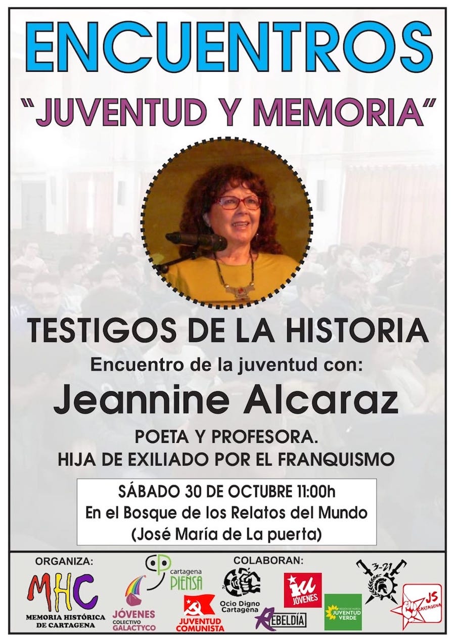 Jeannine, testigo de nuestra Historia, compartirá sus vivencias y responderá a las preguntas que se le formulen en este encuentro con la Juventud, en el Bosque de los Relatos del Mundo, el sábado, día 30, a las 11:00 h; el tercero de esta serie programada por la Asociación de Memoria Histórica de Cartagena, en colaboración con el programa Cartagena Piensa, de la Concejalía de Cultura y gracias al apoyo de Juventudes Socialistas, Comité 3 - 21, Juventud Verde, Rebeldía, Izquierda Unida Jóvenes, Ocio Digno Cartagena, Juventud Comunista y Jóvenes Colectivo Galactyco y de la ayuda de la AVV José María de Lapuerta.