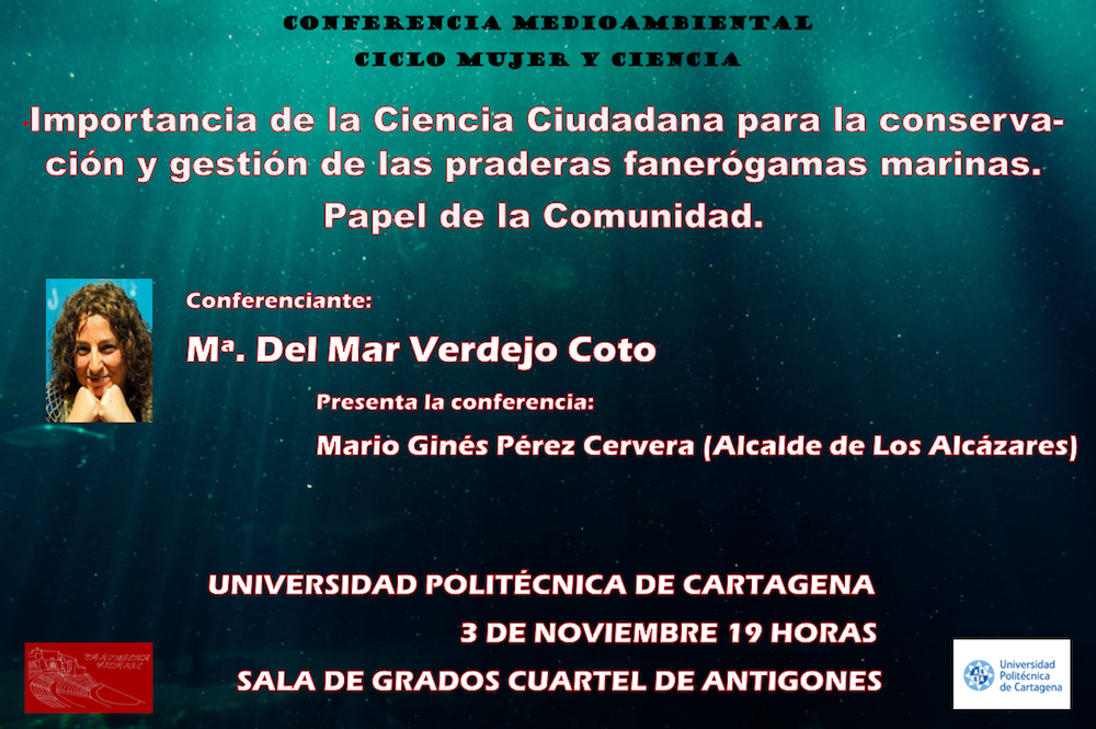 La UPCT acoge esta tarde (19 horas) la conferencia de María del Mar Verdejo Coto, que será presentada por el alcalde de Los Alcázares, Mario Ginés Pérez Cervera, dentro de las ‘Jornadas culturales 2021’ que organiza ‘Cartagena siempre’. El tema es ‘Importancia de la ciencia ciudadana para la conservación y gestión de las praderas fanerógamas marinas. Papel de la Comunidad’.