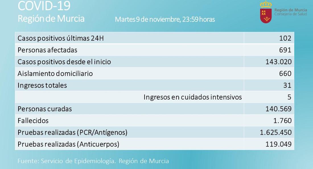 De los 102 nuevos casos en la Región de Murcia, 24 corresponden al municipio de Cartagena, 22 a Murcia, 10 a Mazarrón, 6 a La Unión, 5 a Torre Pacheco, 4 a Archena, 3 a Alcantarilla, 3 a Cehegín, 3 a Mula, 3 a San Pedro del Pinatar. El resto están repartidos por los demás municipios. Hubo un fallecimiento a causa del coronavirus en la jornada de ayer. Se trata de un varón de 48 años, del área de Salud III (Lorca).