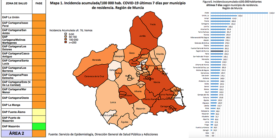 El municipio sigue entre los que más incidencia de casos tiene en la Región de Murcia con 847 casos (125 ayer) en los últimos siete y todas sus instalaciones sanitarias están en riesgo alto de contagio. Ayer fueron 541 los contagios detectados en territorio autonómico, con un fallecido de 63 años de edad.