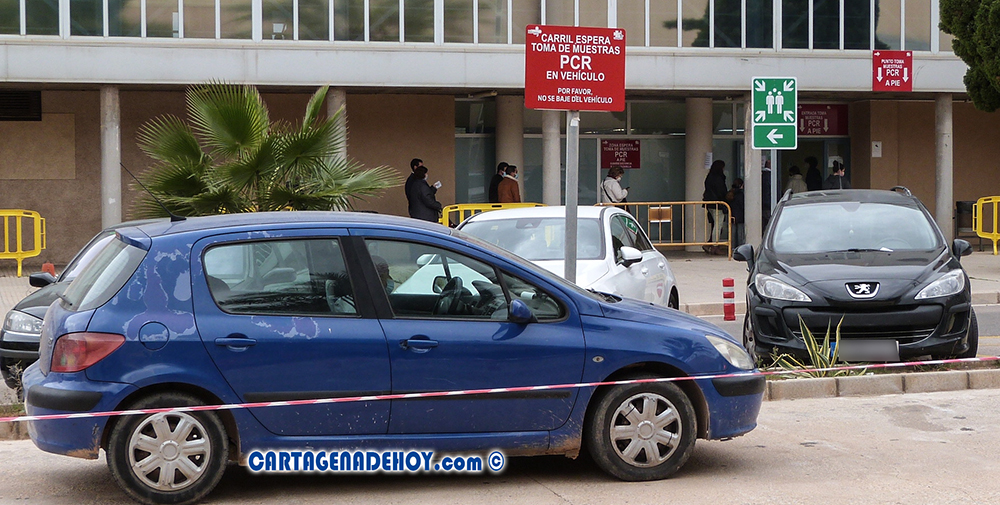Han sido 931 los infectados detectados el martes con cerca de una quinta parte ubicados en Cartagena. Lo mejor es que no hubo fallecidos. Las autoridades sanitarias sospechan de que ya hay algún caso de la variante ómicron en el territorio autonómico. La foto muestra las largas colas que de personas a pie y en vehículos que se están formando estos días en el hospital del Rosell para efectuarse PCR.