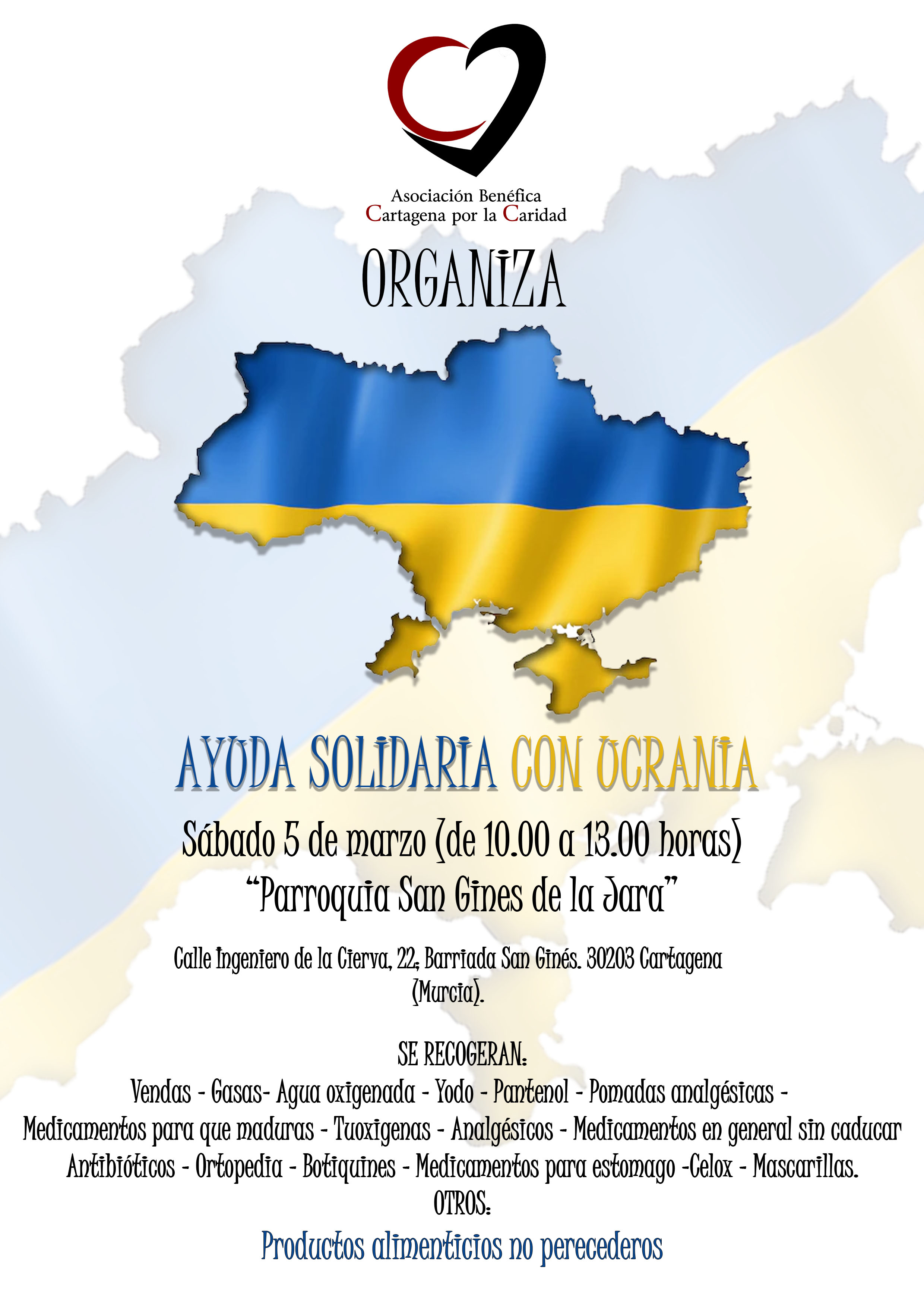 La parroquia de San Ginés de la Jara recogerá el próximo sábado, de 10 a 13 horas, alimentos para ayudar a la comunidad ucraniana. La Asociación Benéfica Cartagena por la Caridad, en colaboración con el sacerdote Andrei de la Iglesia Ortodoxa de la comunidad ucraniana en Cartagena, ha establecido un punto de recogida de material sanitario y alimentos no perecederos para ser enviados a Ucrania.