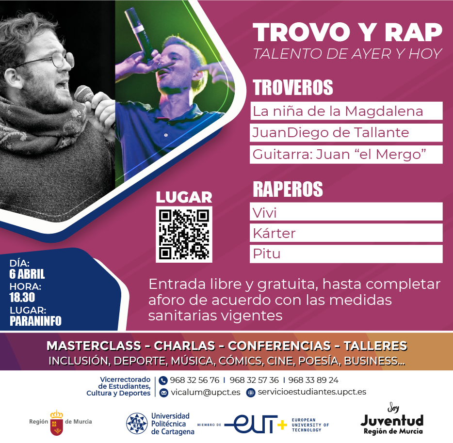 Troveros y raperos se darán la mano el próximo 6 de abril a las 18.30 horas e el paraninfo de la UPCT para conjugar su arte. En sus 150 años de historia, desde sus orígenes mineros hasta el festival internacional de poesía improvisada TROVALIA, el trovo de Cartagena es un referente de peso en la poesía oral de España e Iberoamérica.
