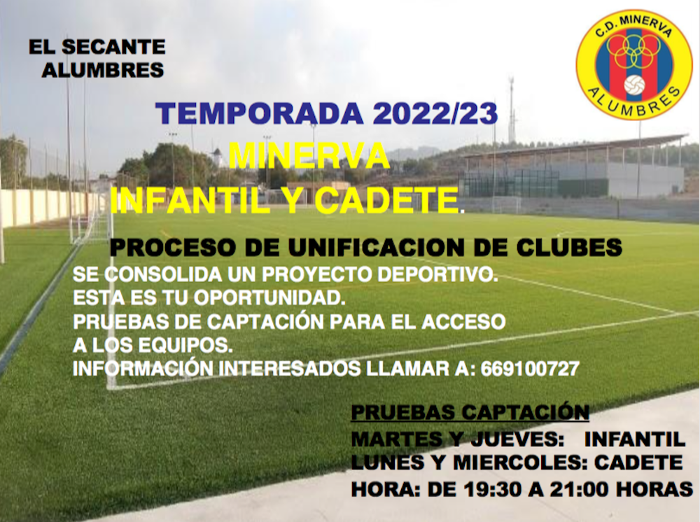 El CD Minerva ya prepara la nueva temporada con renovadas ilusiones, pues es la de la unificación de clubes locales para trabajar por un objetivo común con el fútbol base, que podrán culminar su formación con el equipo de superior categoría. Las pruebas para futbolistas infantiles y cadetes comienzan esta semana.