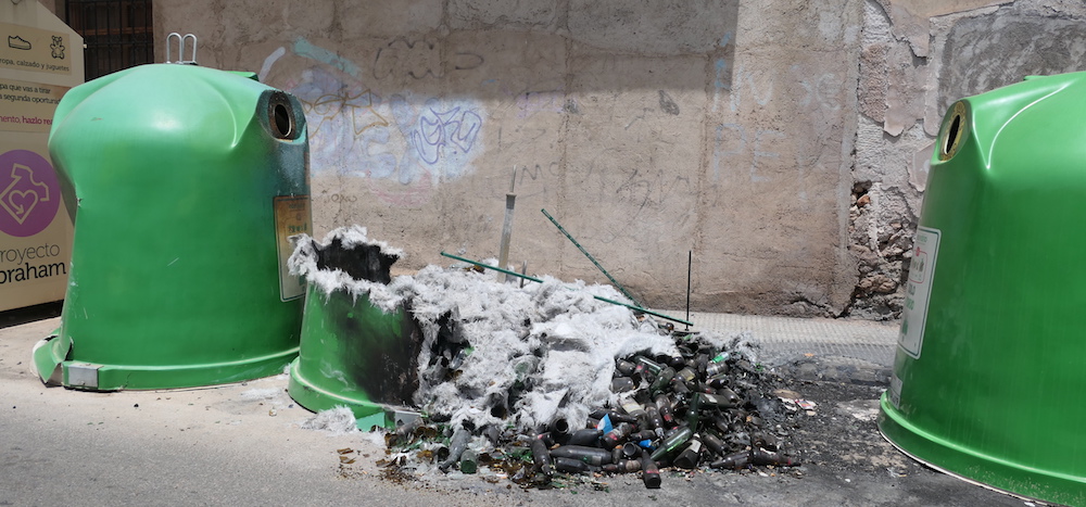 Un vecino se ha dirigido a nuestro 'Buzón de los lectores' para enviar una fotografía de un recipiente de recogida de vídrio quemado en la calle Puerto del Escudo de dicha población, el mismo lugar donde fueron quemados varios contenedores en la noche de San Juan. Cabe recordar que reponer cada uno de los contenedores de plástico es de 800 euros y que los de vídrio tienen un precio superior.