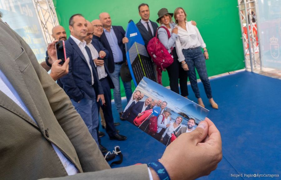 El escenario instalado en la Plaza de San Sebastián de la ciudad portuaria recibió a cuantos turistas y residentes quisieron fotografiarse recreando como escenario de fondo alguno de los rincones más emblemáticos de la Región, entre ellos, al Azud de Ojós, el Teatro Romano de Cartagena, la basílica de Caravaca de la Cruz, la sinagoga de Lorca, Calblanque, Sierra Espuña o la Plaza de Belluga de Murcia.
