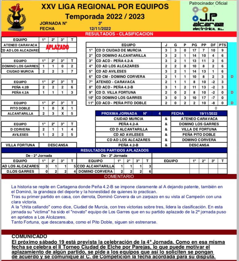 El equipo B de la Peña 4.2 suma su primera victoria de la liga regional al vencer por 6-3 al A, que marchaba invicto. Por su parte, Peña Pito Doble de la barriada de José María Lapuerta perdió ante Alcantarilla por 1-5.