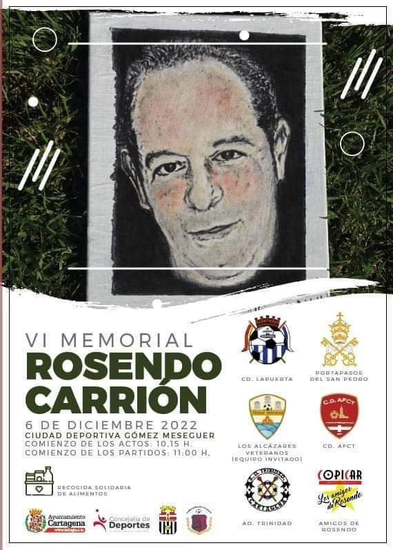 Este martes 6 de diciembre tendrá lugar en la Ciudad Deportiva Gómez Meseguer, la 6ª edición del “Memorial Rosendo Carrión”, que contará este año con la presencia de 6 equipos, para disputar el habitual torneo de Futbol Veterano y aficionado para recordar la figura de Rosendo Carrión, que falleció el 6 de Diciembre de 2016 mientras se celebraba un trofeo también de equipos veteranos en el Campo de San Juan Bosco de la Barriada de Los Dolores. Lo que era una jornada Festiva y un encuentro entre antiguos Jugadores de varios equipos de la ciudad de Cartagena, acabo tristemente. Pero Familiares y amigos desde entonces, cada 6 de diciembre no olvidan la memoria de este conocido Cartagenero y celebran varios actos en honor a su memoria.