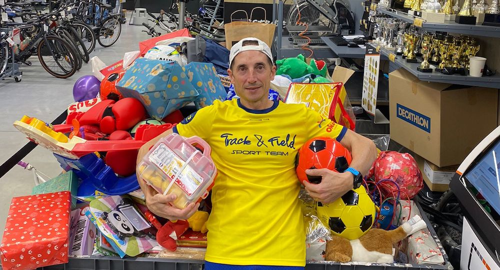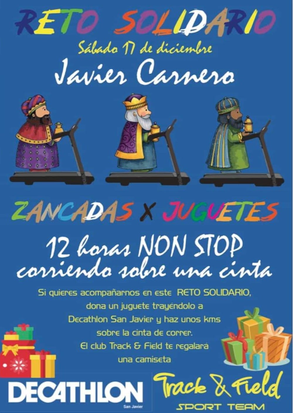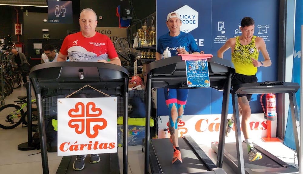 Javier Carnero, atleta afincado en Cartagena, se fijó un solidario reto, que no haya niños sin juguetes esta Navidad, y con ese compromiso se subió a una cinta para estar medio día dando zancadas sin parar.