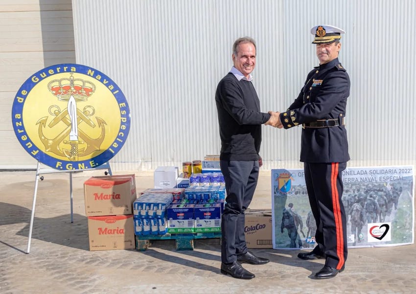 La primera donación se hizo a la Fuerza de Guerra Naval Especial en la operación ´Tonelada solidaria especial´, que hace entrega de alimentos en diferentes localidades del Camino de la Cruz, entre Cartagena y Caravaca. Los productos fueron transportados por los militares en sus mochilas.