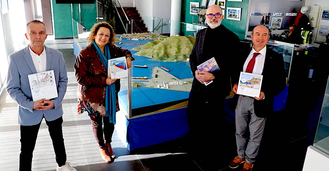 La presidenta de la APC, Yolanda Muñoz, y el humorista gráfico, José Manuel Puebla, han presentado esta mañana la tercera edición del calendario 2023 de la Autoridad Portuaria, “una nueva edición que recoge en 13 viñetas los hitos del Puerto de Cartagena como motor económico y social de Cartagena y la Región”, acompañados del director de la APC, Fermín Rol, y del cartagenero Pruden Pelegrín que ha colaborado aportando la fotografía de la portada del calendario.