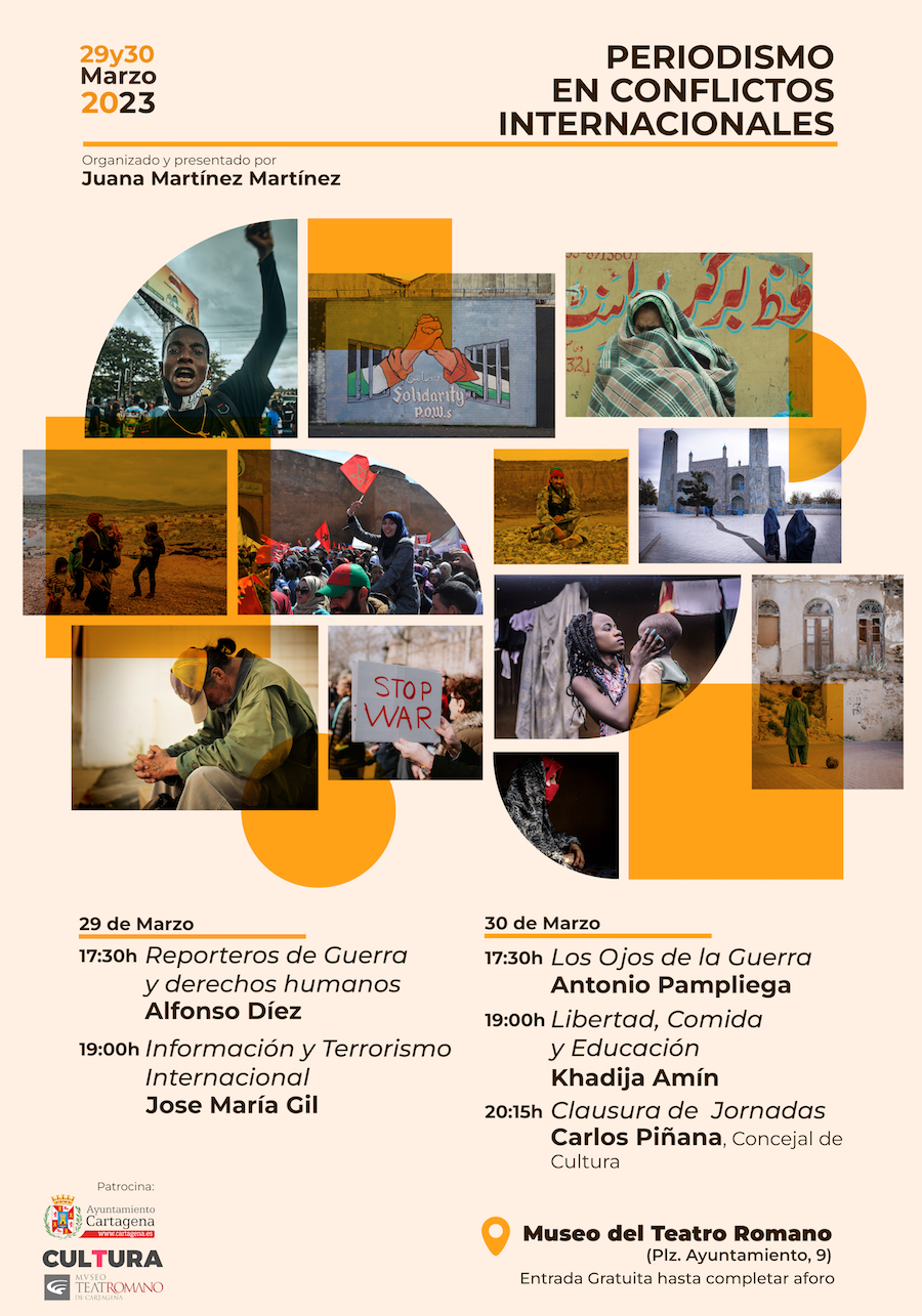 Los periodistas Alfonso Diez, José María Gil, Antonio Pampiega y Khadija Amín contarán sus experiencias bélicas en unas jornadas sobre periodismo en conflictos internacionales, que se celebrarán esta semana (miércoles y jueves por la tarde) en el Museo del Teatro Romano, patrocinadas por el Ayuntamiento de Cartagena. Serán cuatro charlas organizadas y presentadas por la periodista cartagenera Juana Martínez.