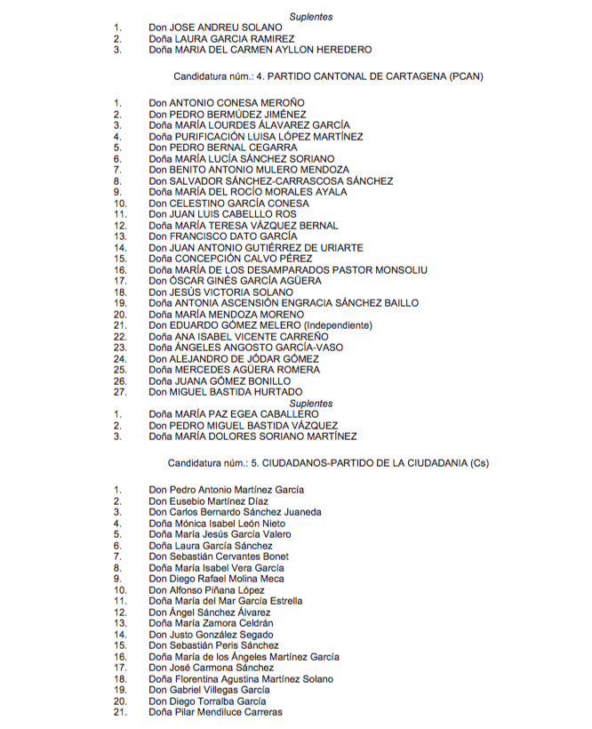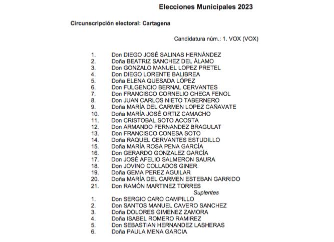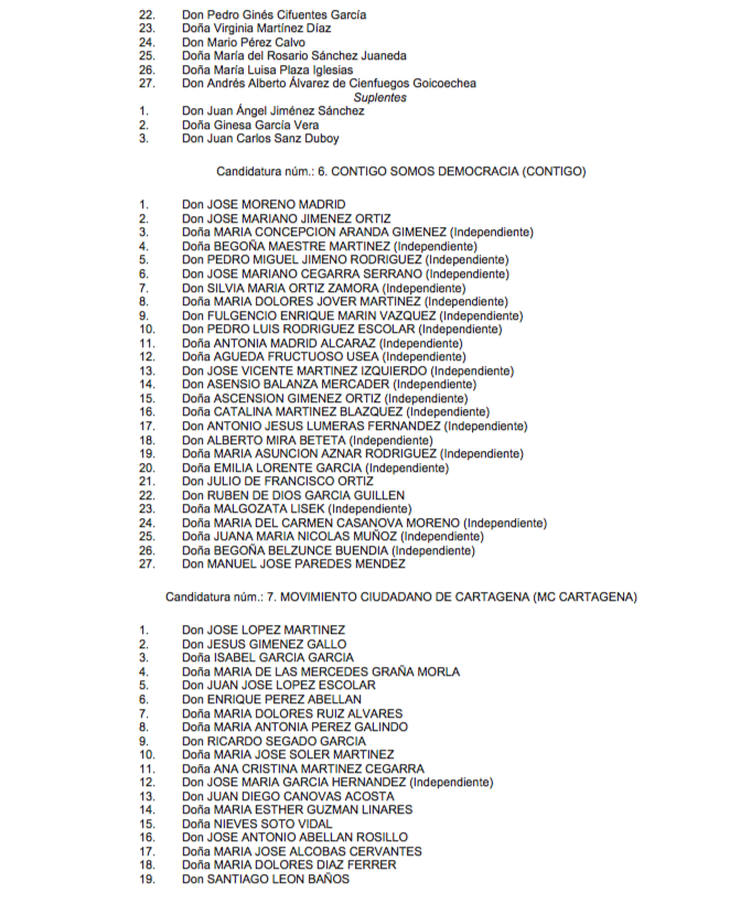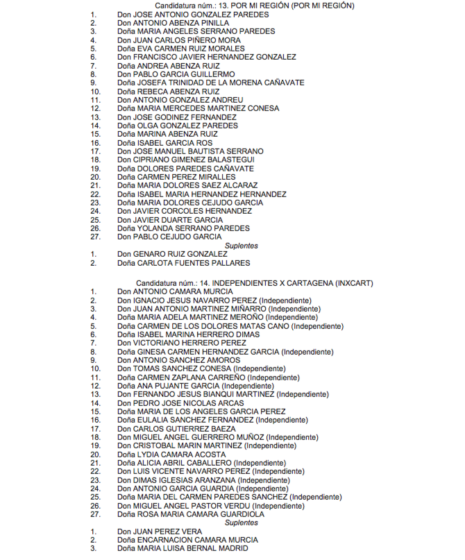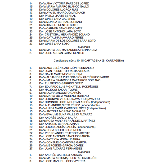 Ofrecemos la relación oficial publicada en el Boletín Oficial de la Región de Murcia de las 14 candidaturas que aspiran a los 27 puestos de concejal que hay en juego, que por el orden en el que aparecen y con sus cabezas de lista entre paréntesis, son: VOX (Diego Salinas), Partido Popular (Noelia Arroyo), PSOE (Manuel Torres), Partido Cantonal (Antonio Conesa), Ciudadanos (Pedro Martínez), Contigo Somos Democracia (José Moreno), Movimiento Ciudadano de Cartagena (José López), Más Cartagena-Verdes Equo (Lorena Lorca), Partido Cartagenerista (Salvador Lara), Sí Cartagena (Ana Belén Castejón), Izquierda Unda-Verdes-Podemos-Alianza Verde (Leli García), Escaños en blanco (Gonzalo Navarro), Por mi Región (José Antonio González) e Independientes X Cartagena (Antonio Cámara).