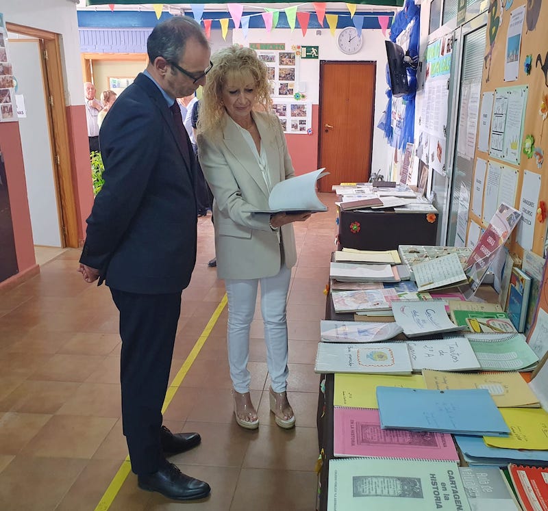 El consejero de Educación, Formación Profesional y Empleo, Víctor Marín, acudió hoy al CEIP La Asomada, de Cartagena, que celebra su 50+3 aniversario, donde visitó la exposición que muestra la historia del colegio y objetos antiguos como documentos, fotocopiadora, revistas y material del alumnado.