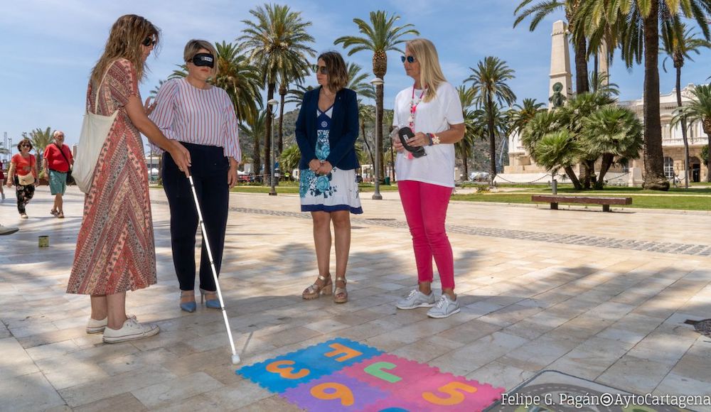 El acto, que se ha desarrollado con motivo de la Semana del Grupo Social ONCE en la Región de Murcia, ha permitido al público cartagenero, a turistas, y todo aquel que ha querido acercarse a la acción, cómo es la sensación de las personas que viven con problemas de visión; haciendo un primer recorrido acompañado por el bastón pisando diferentes superficies, potenciar el olfato y el tacto.