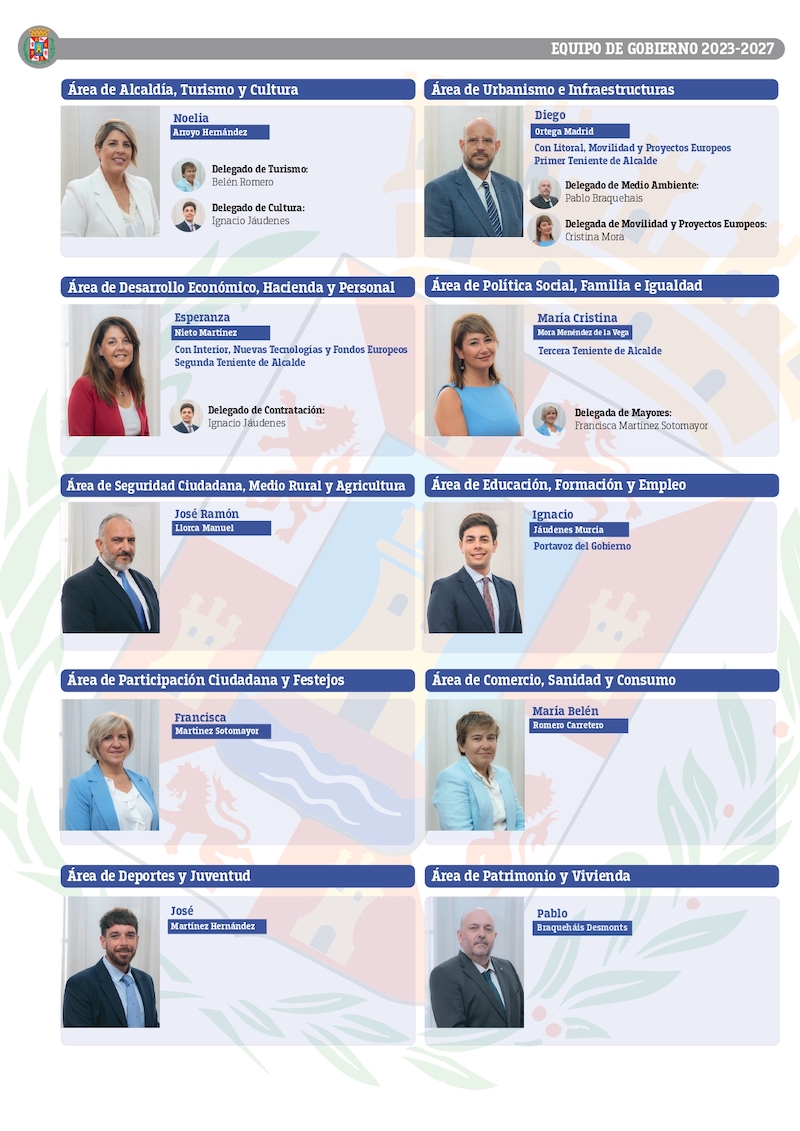 Tendrá diez áreas, una por concejal del PP, asumiendo la alcaldesa las competencias de Turismo y Cultura. Diego Ortega llevará Urbanismo e Infraestructuras, seguridad ciudadana y medio rural será para José Ramón Llorca y Paqui Martínez Sotomayor llevará participación ciudadana y festejos.
