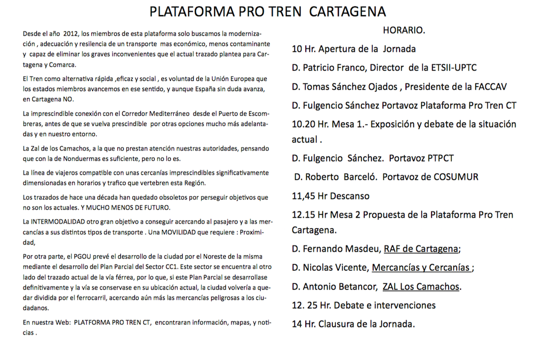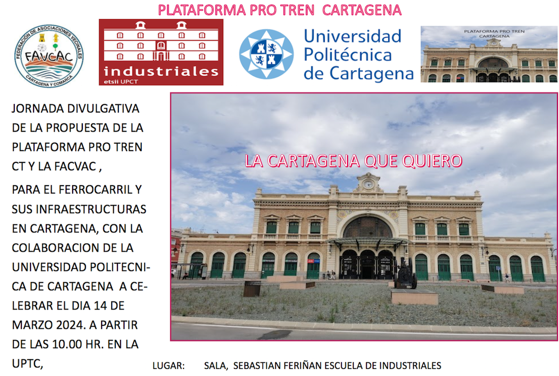 La plataforma Pro-Tren Cartagena, la Federación de Asociaciones de Vecinos y la UPCT convocan a la ciudadanía a una jornada divulgativa titulada 'La Cartagena que quiero' que tendrá lugar el jueves 14 de marzo en la sala 'sebastián Feriñán' de la Escuela de Industriales, a partir de las 10 horas, en la que se informará de su propuesta para las infraestructuras ferroviarias que precisa la ciudad.