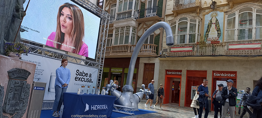Un gran grifo de 4,5 metros de altura se ha colocado en la plaza de San Sebastián de Cartagena, donde un estand y la proyección de un sport con el actor Carlos Santos y otros conocidos rostros han potenciado la confianza de la población en el agua corriente, desterrando ideas erróneas. "Hay personas que aún no saben que el agua del grifo, que pasa miles controles, se puede beber", expone el gerente, Andrés Martínez.