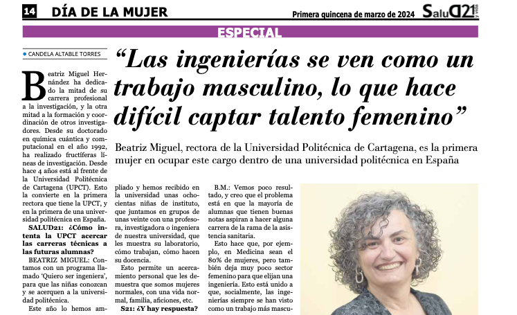 La publicación sanitaria regional centrada en la salud llega a su ejemplar número 367 con un número que incluye un especial sobre el 8M, que incluye una entrevista a la rectora de la UPCT como pionera en ocupar un máximo cargo en una universidad politécnica española. También se destaca que el ejercicio físico es el mejor remedio contra las secuelas de la vejez.