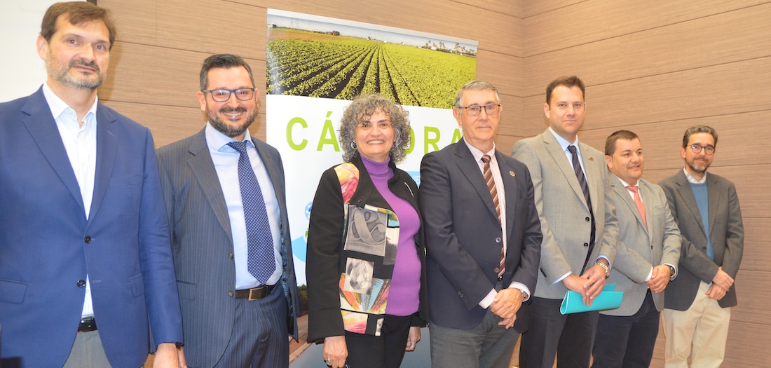Los investigadores de la cátedra Trasvase y Sostenibilidad - José Manuel Claver Valderas muestran los ensayos que han llevado a cabo l en los últimos siete años para transferirlos a técnicos y regantes.  Foto: Pie de foto: la rectora de la UPCT, Beatriz Miguel; el presidente de la Confederación Hidrográfica del Segura, Mario Urrea; el director general del Agua de la Comunidad Autónoma, José Sandoval; y el secretario general del Sindicato Central de Regantes, José Ángel Pérez Abellán.